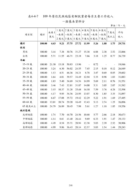 表4-4-7 109 年原住民族地區有酬就業者每月主要工作收入