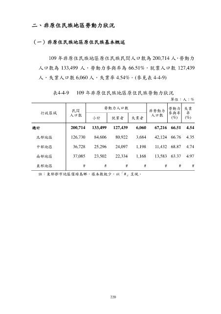 表4-4-9 109 年非原住民族地區原住民族勞動力狀況
