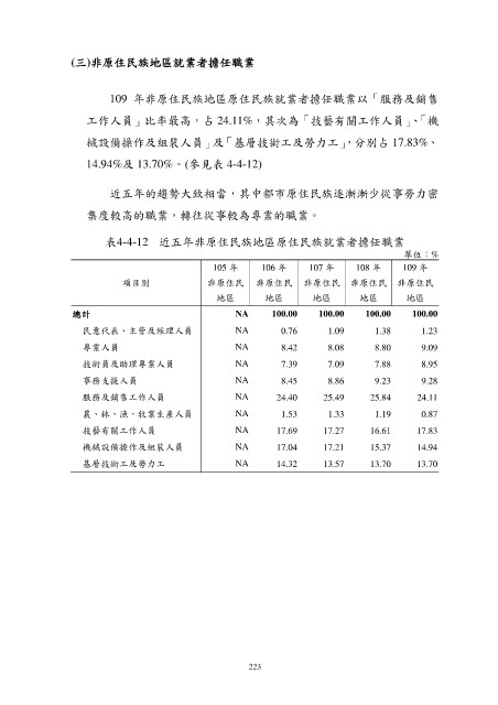 表4-4-12 近五年非原住民族地區原住民族就業者擔任職業