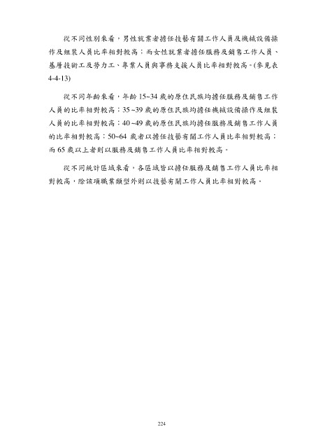 人員的比率相對較高;40 ~49 歲的原住民族均擔任服務及銷售工作人員