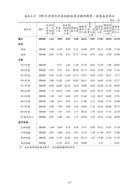 表4-4-13 109 年非原住民族地區就業者擔任職業-按基本資料分