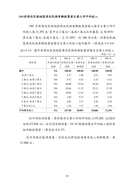 109 年非原住民族地區原住民族有酬就業者每人每月主要工作平