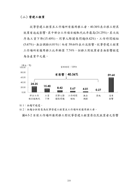 從事營建工程業且工作場所有僱用移工者,40.36%表示移工對其