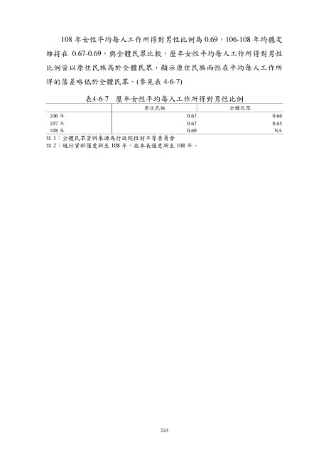 108 年女性平均每人工作所得對男性比例為 0.69,106-108 年均穩定