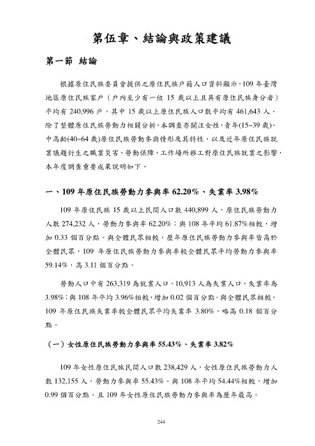 一、109 年原住民族勞動力參與率 62.20%、失業率 3.98%