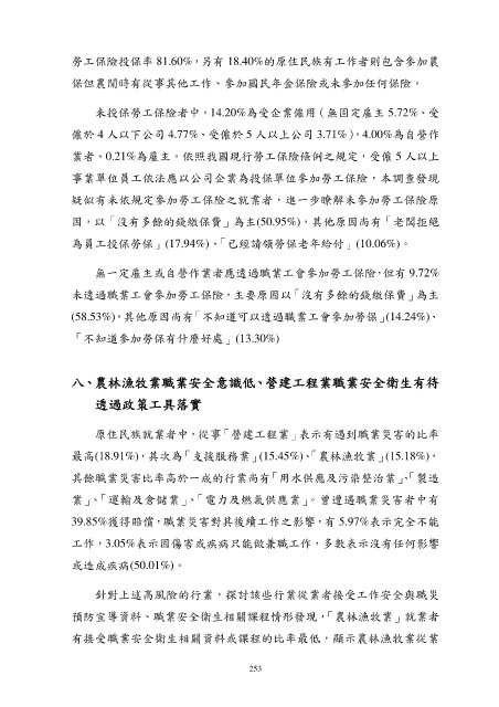 勞工保險投保率 81.60%,另有 18.40%的原住民族有工作者則包含參加農