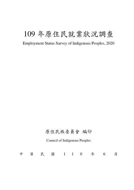 109 年原住民就業狀況調查 Employment Status Survey of Indigenous Peoples, 2020 原住民族委員會 編印 Council of Indigenous Peoples 中 華 民 國 1 1 0 年 6 月