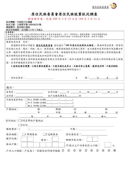 典通股份有限公司接受 原住民族委員會 委託進行「109 年原住民就業狀況調查」,因為研究的需要,將會詢