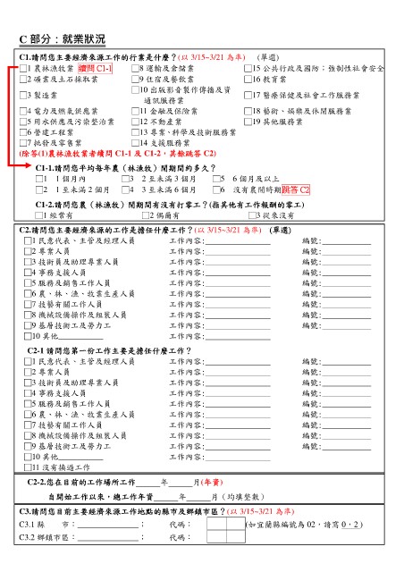 (除答(1)農林漁牧業者續問 C1-1 及 C1-2,其餘跳答 C2)
