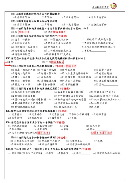 □9 沒有參加任何社會保險續答 E14-1 勾選 1~8 跳答 E15