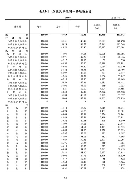 表A1-1 原住民族性別-按地區別分