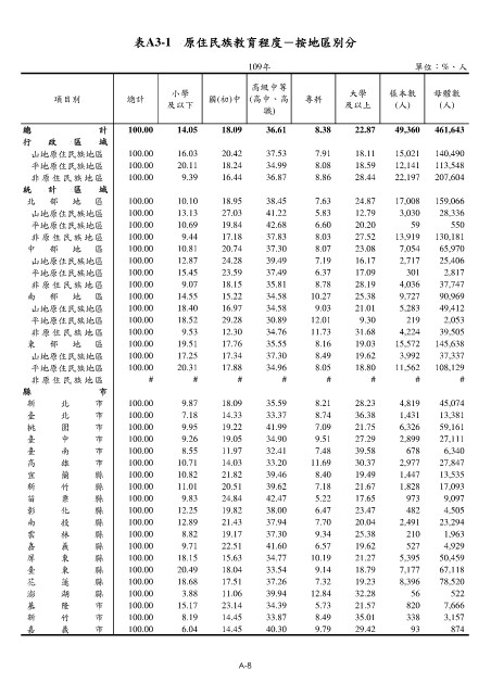 表A3-1 原住民族教育程度-按地區別分