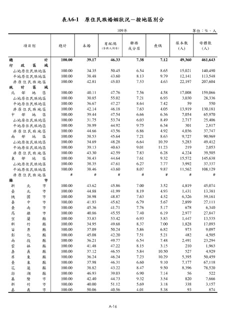 表A6-1 原住民族婚姻狀況-按地區別分