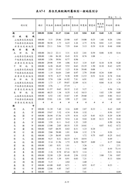 表A7-1 原住民族配偶所屬族別-按地區別分 表A7-1 原住民族配偶所屬族別-按地區別分(續)