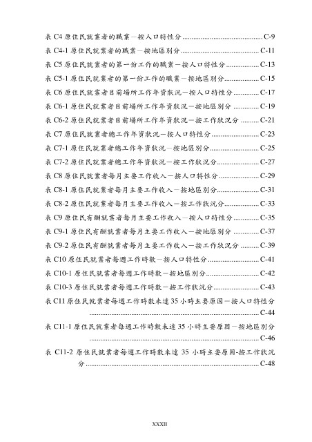 表 C9 原住民有酬就業者每月主要工作收入-按人口特性分 .............. C-35