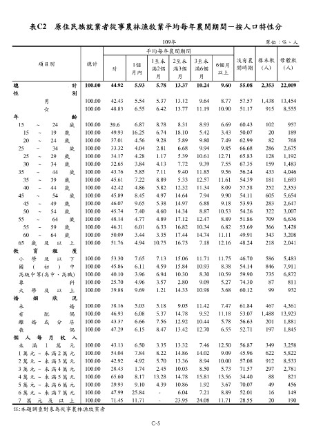 表C2 原住民族就業者從事農林漁牧業平均每年農閒期間-按人口特性分