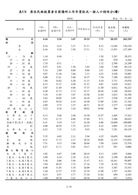 表C6 原住民族就業者目前場所工作年資狀況-按人口特性分(續)