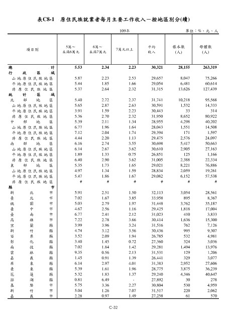表C8-1 原住民族就業者每月主要工作收入-按地區別分(續)