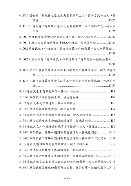 表 E1-1 原住民未參與勞動原因-按地區別分 ......................................... E-2