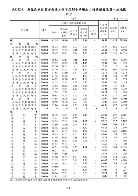 表C12-1 原住民族就業者每週工作不足35小時增加工時意願及原因-按地區