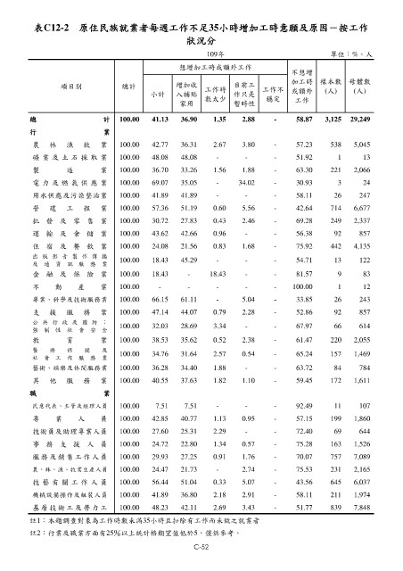表C12-2 原住民族就業者每週工作不足35小時增加工時意願及原因-按工作