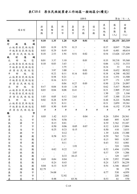 表C15-1 原住民族就業者工作地區-按地區分(續完)