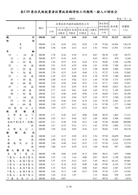 表C19 原住民族就業者從事政府臨時性工作期限-按人口特性分