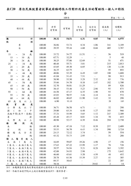 表C20 原住民族就業者從事政府臨時性工作對於改善生活的幫助性-按人口特性