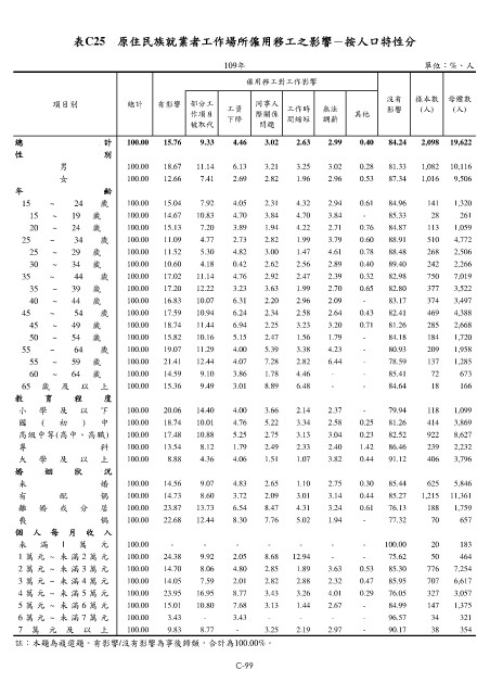 表C25 原住民族就業者工作場所僱用移工之影響-按人口特性分