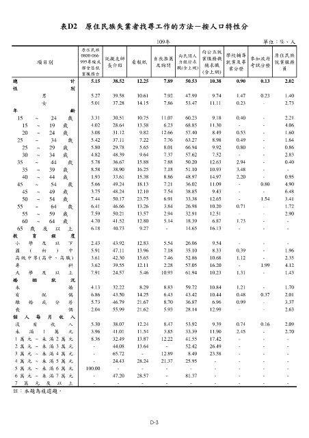 表D2 原住民族失業者找尋工作的方法-按人口特性分