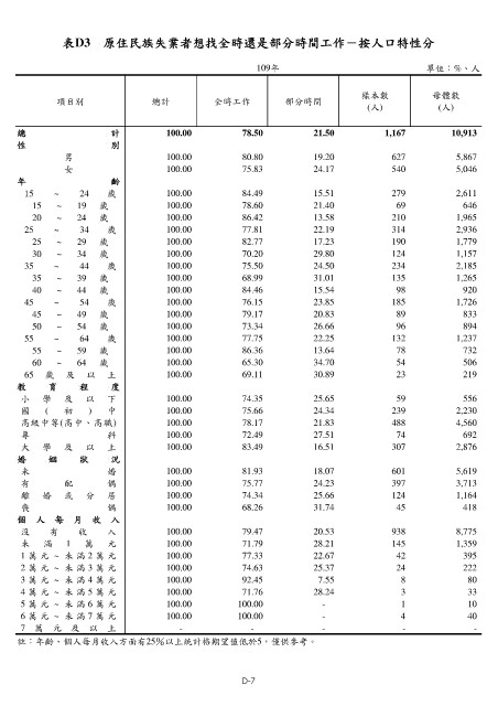 表D3 原住民族失業者想找全時還是部分時間工作-按人口特性分