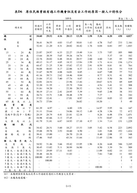 表D6 原住民族曾經有過工作機會但沒有去工作的原因-按人口特性分