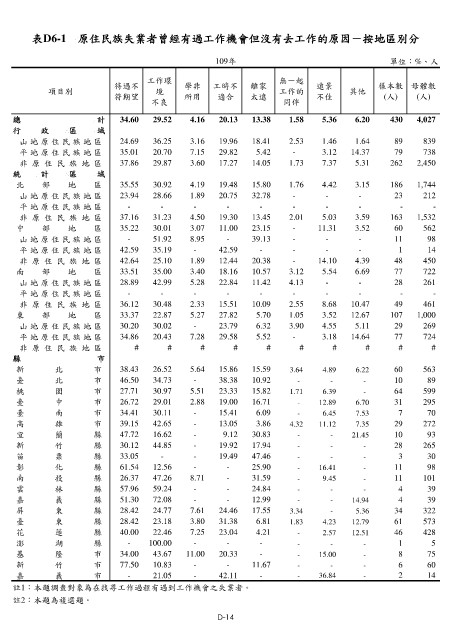 表D6-1 原住民族失業者曾經有過工作機會但沒有去工作的原因-按地區別分