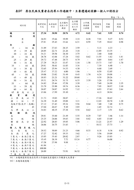 表D7 原住民族失業者在找尋工作過程中,主要遭遇的困難-按人口特性分