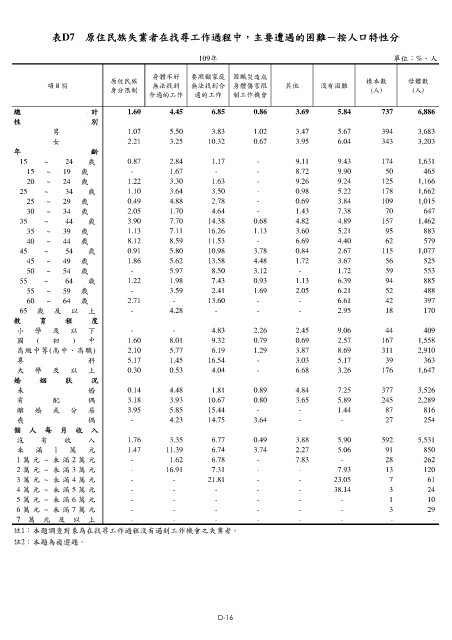表D7 原住民族失業者在找尋工作過程中,主要遭遇的困難-按人口特性分