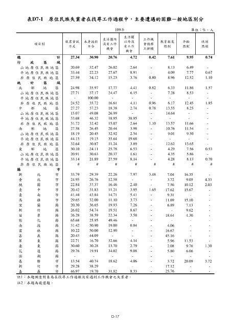 表D7-1 原住民族失業者在找尋工作過程中,主要遭遇的困難-按地區別分