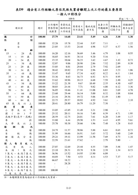 表D9 過去有工作經驗之原住民族失業者離開上次工作的最主要原因