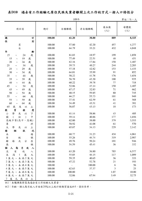 表D10 過去有工作經驗之原住民族失業者離開上次工作的方式-按人口特性分