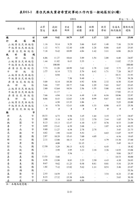 表D11-1 原住民族失業者希望從事的工作內容-按地區別分(續)
