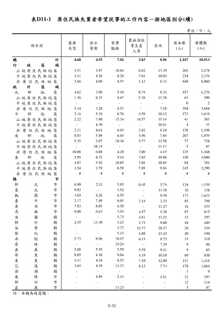 表D11-1 原住民族失業者希望從事的工作內容-按地區別分(續)