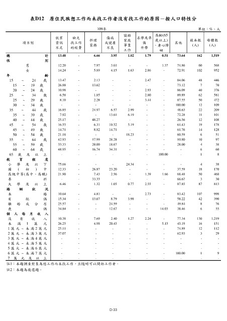 表D12 原住民族想工作而未找工作者沒有找工作的原因-按人口特性分