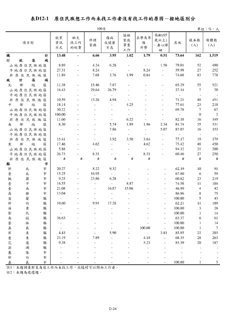 表D12-1 原住民族想工作而未找工作者沒有找工作的原因-按地區別分