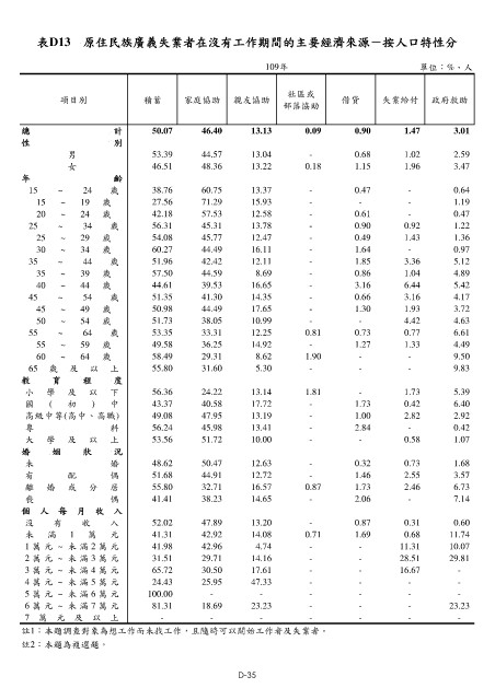 表D13 原住民族廣義失業者在沒有工作期間的主要經濟來源-按人口特性分