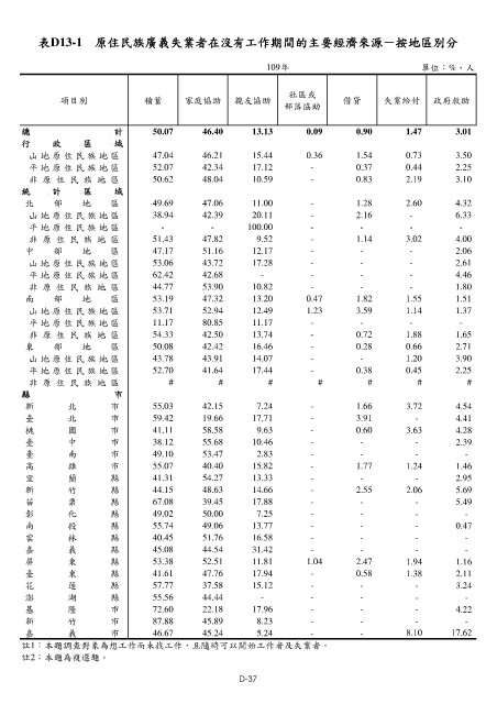 表D13-1 原住民族廣義失業者在沒有工作期間的主要經濟來源-按地區別分
