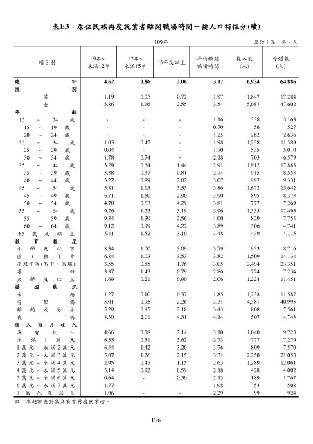 表E3 原住民族再度就業者離開職場時間-按人口特性分(續)