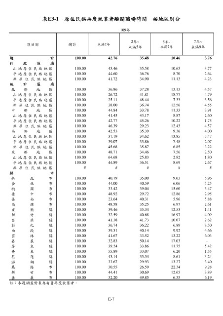 表E3-1 原住民族再度就業者離開職場時間-按地區別分