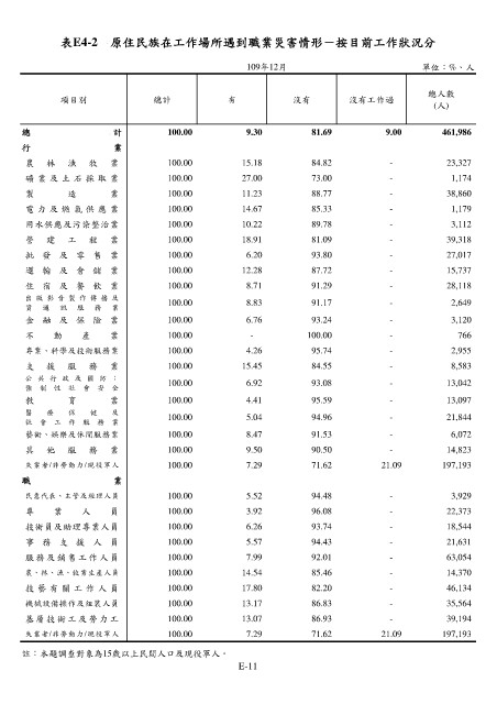 表E4-2 原住民族在工作場所遇到職業災害情形-按目前工作狀況分