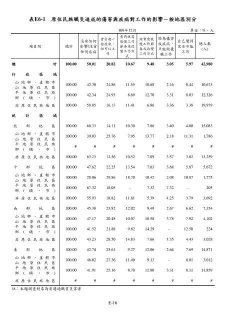 表E6-1 原住民族職災造成的傷害與疾病對工作的影響-按地區別分
