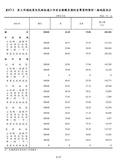表E7-1 有工作過的原住民族收過工作安全與職災預防宣導資料情形-按地區別分