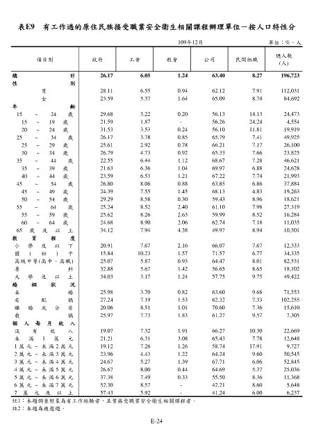 表E9 有工作過的原住民族接受職業安全衛生相關課程辦理單位-按人口特性分